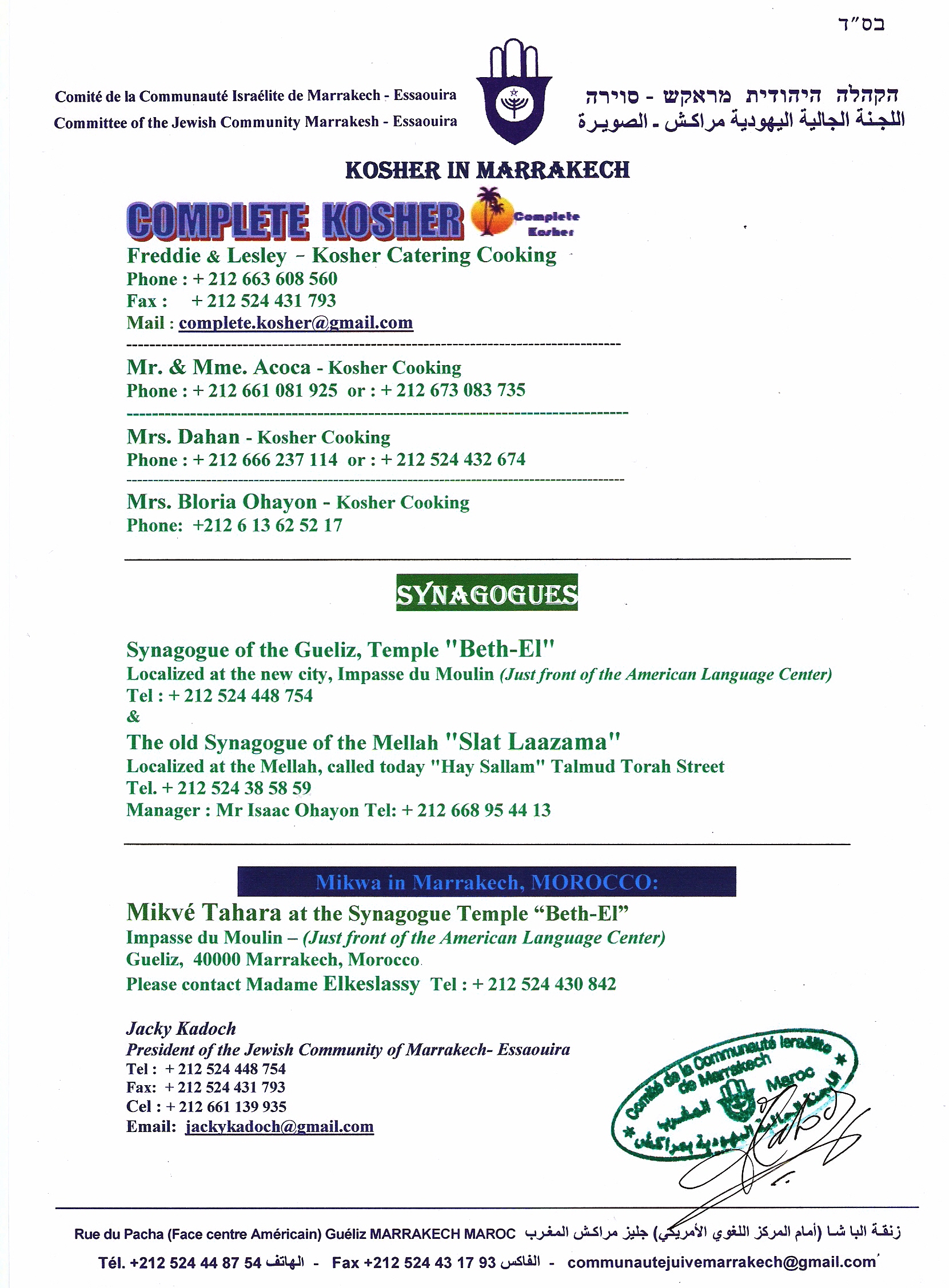 Verify with: Rabbi Yaacov Tordjman, Tangier Mrs. Batcheva Tordjman Phone: + 212 664